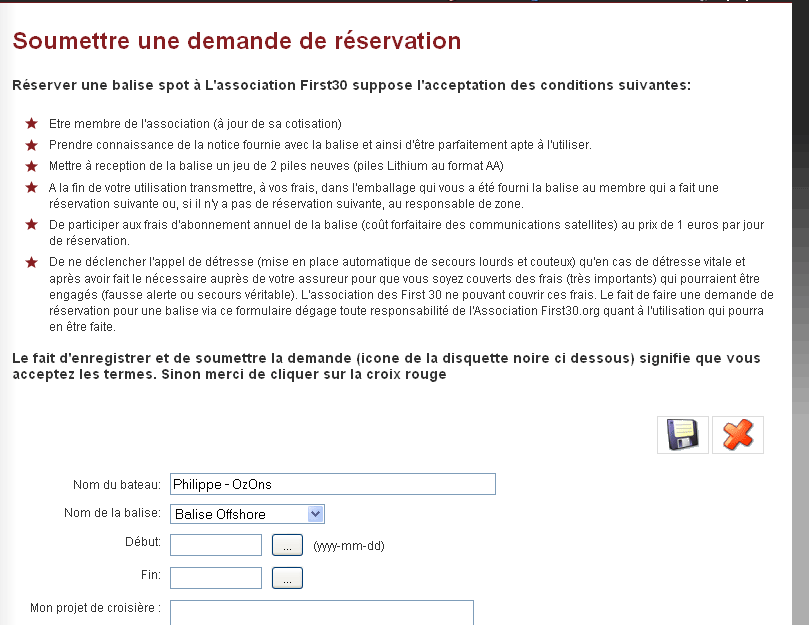 - De ne déclencher l'appel de détresse (mise en place automatique de secours lourds et couteux) qu'en cas de détresse vitale et après avoir fait le nécessaire auprès de votre assureur pour que vous soyez couverts des frais (très importants) qui pourraient être engagés (fausse alerte ou secours véritable). L'association des First 30 ne pouvant couvrir ces frais. Le fait de faire une demande de réservation pour une balise via ce formulaire dégage toute responsabilité de l'Association First30.org quant à l'utilisation (appropriée ou non) qui pourra en être faite.