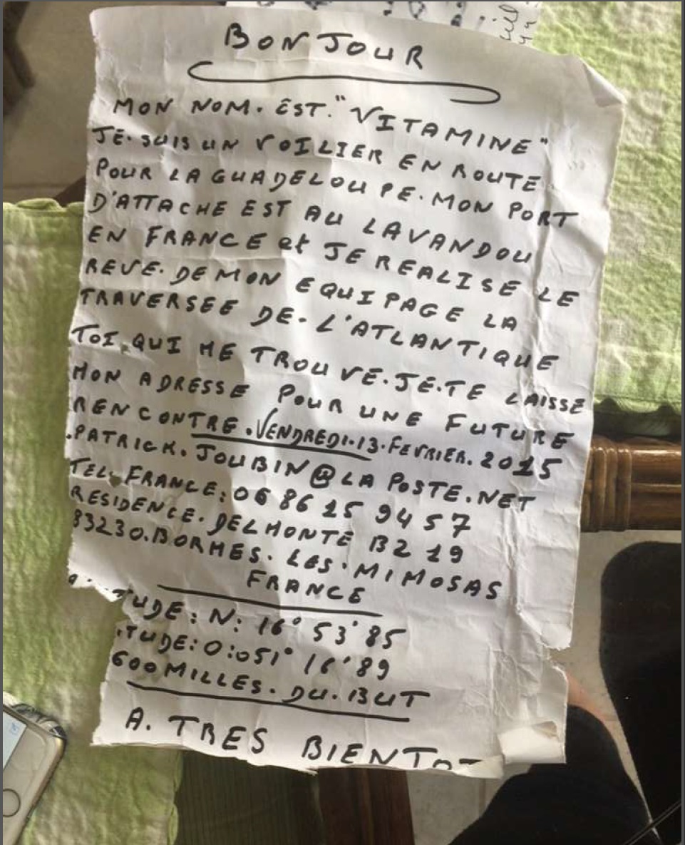 Le 13 février 2015 à environ 900 milles de la Guadeloupe j'ai glissé un message dans une bouteille.