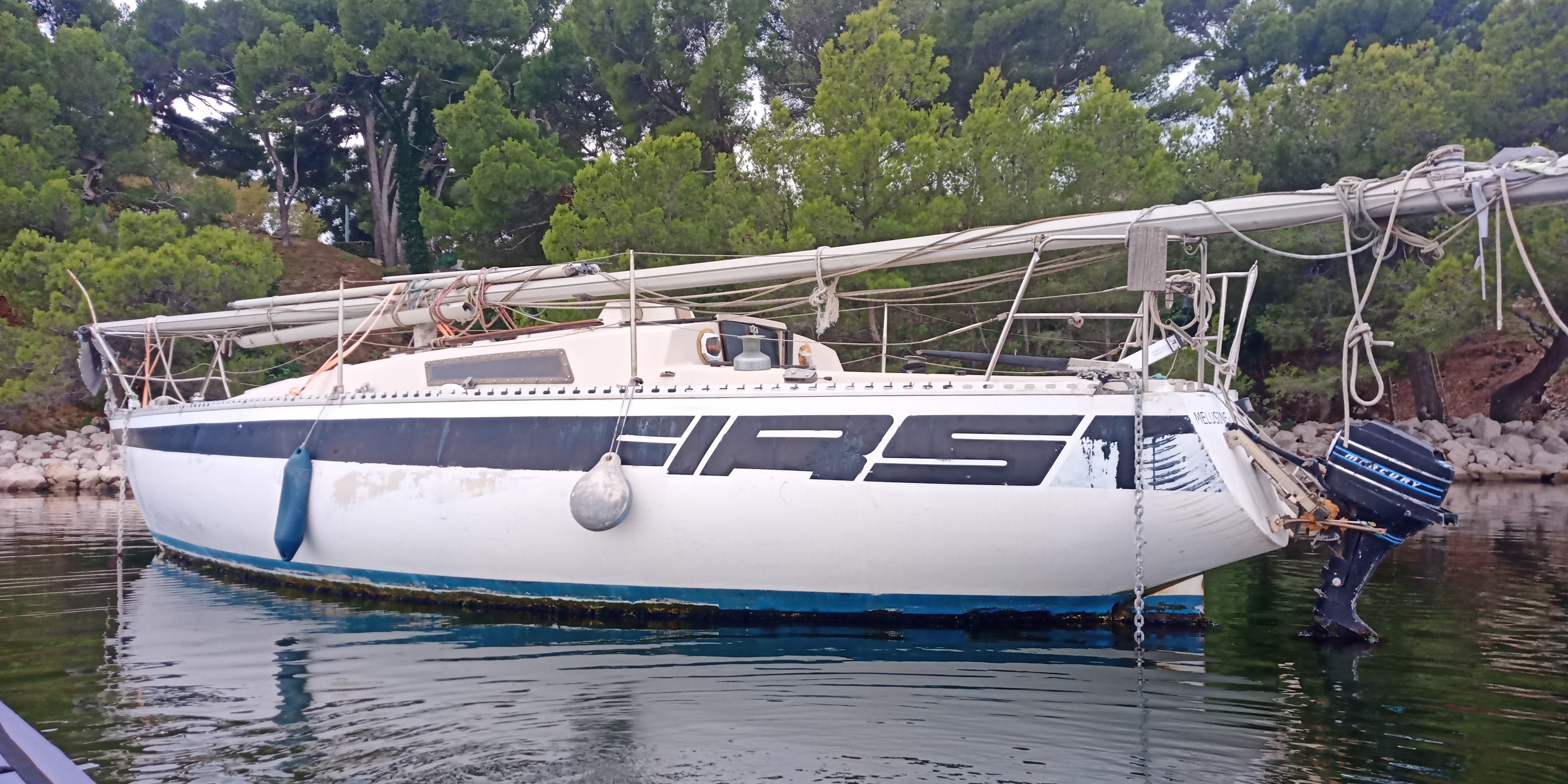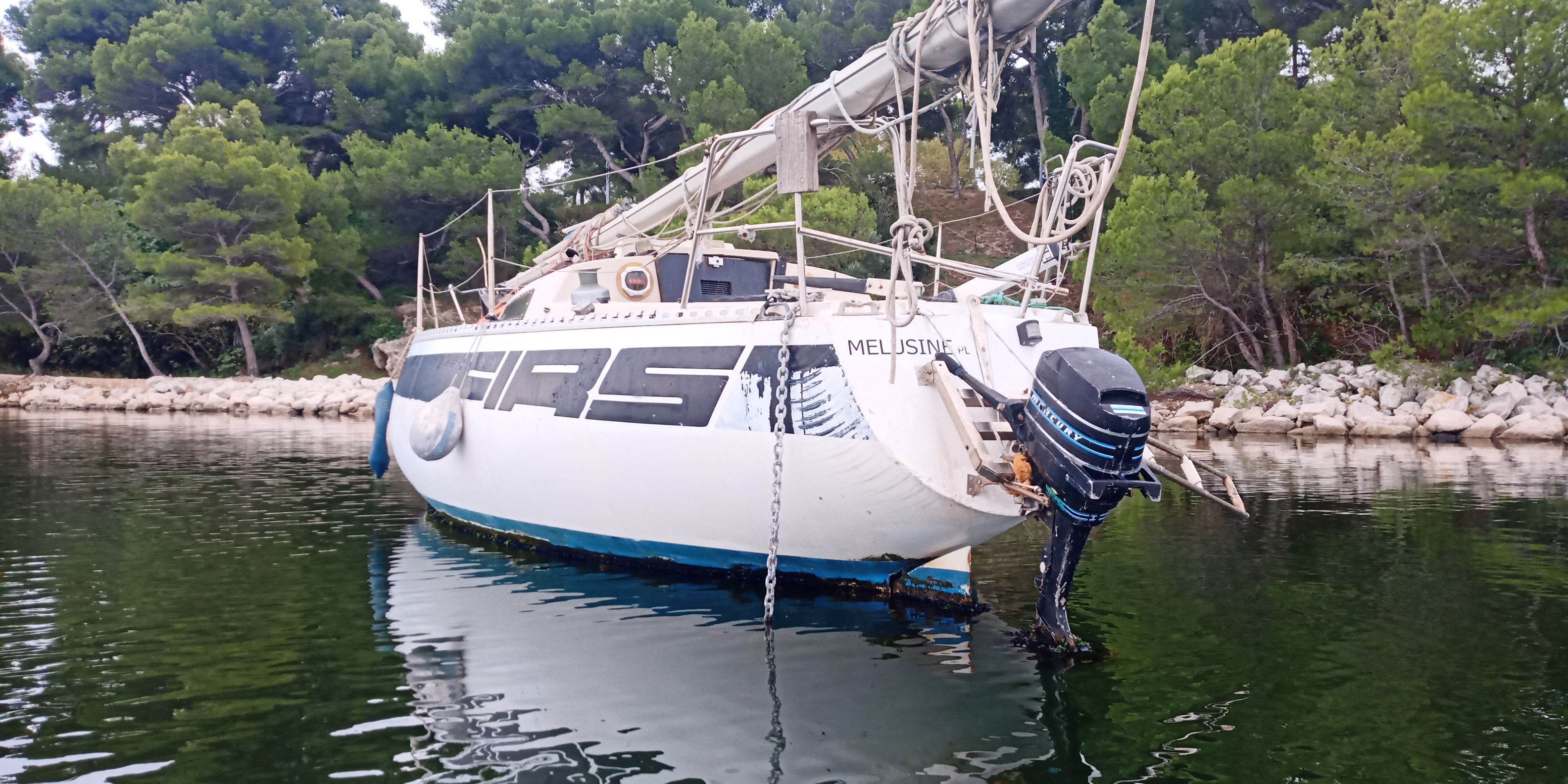 Alain m'avait signalé un First 30 à l'abandon dans le canal de Marseille au Rhône, au niveau de Martigues. Cet après-midi il n'y avait pas de vent, j'ai donc sorti le kayak et je suis allé voir ce First 30 à l'abandon. Il s'agit de Mélusine.