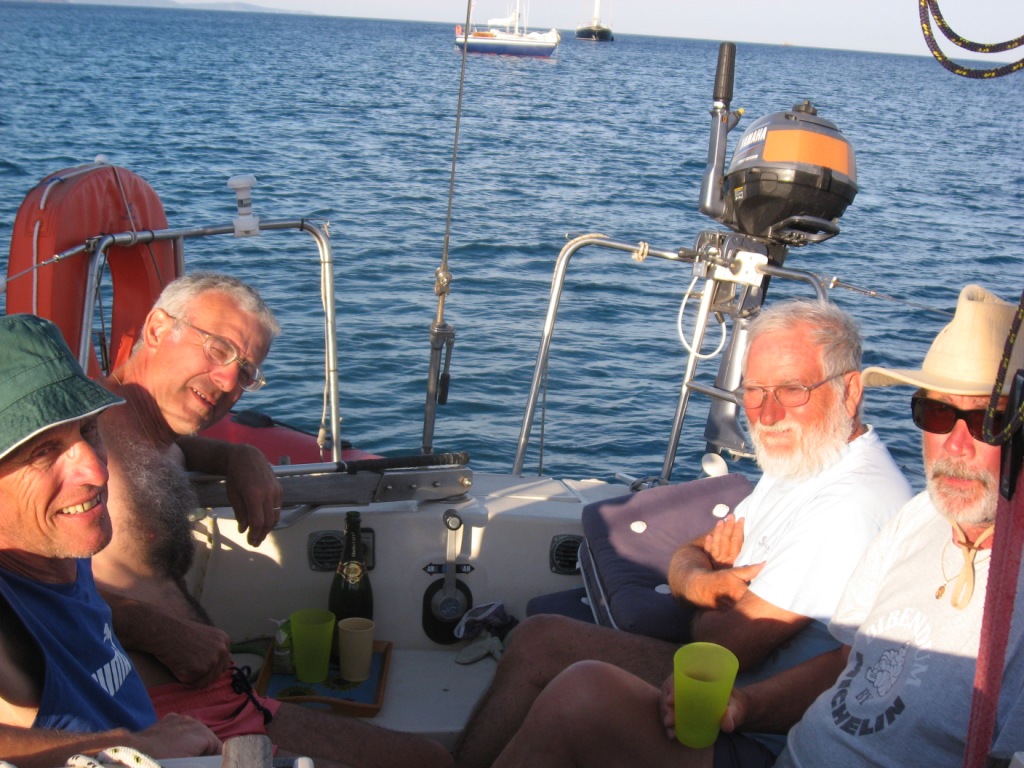 En tout cas, la taille du cockpit du 30 ne gêne en rien l'apéro, comme peuvent en témoigner les quatre propriétaires de First rassemblés sur Taranis au mouillage dans l'anse du Gau. :happy1: