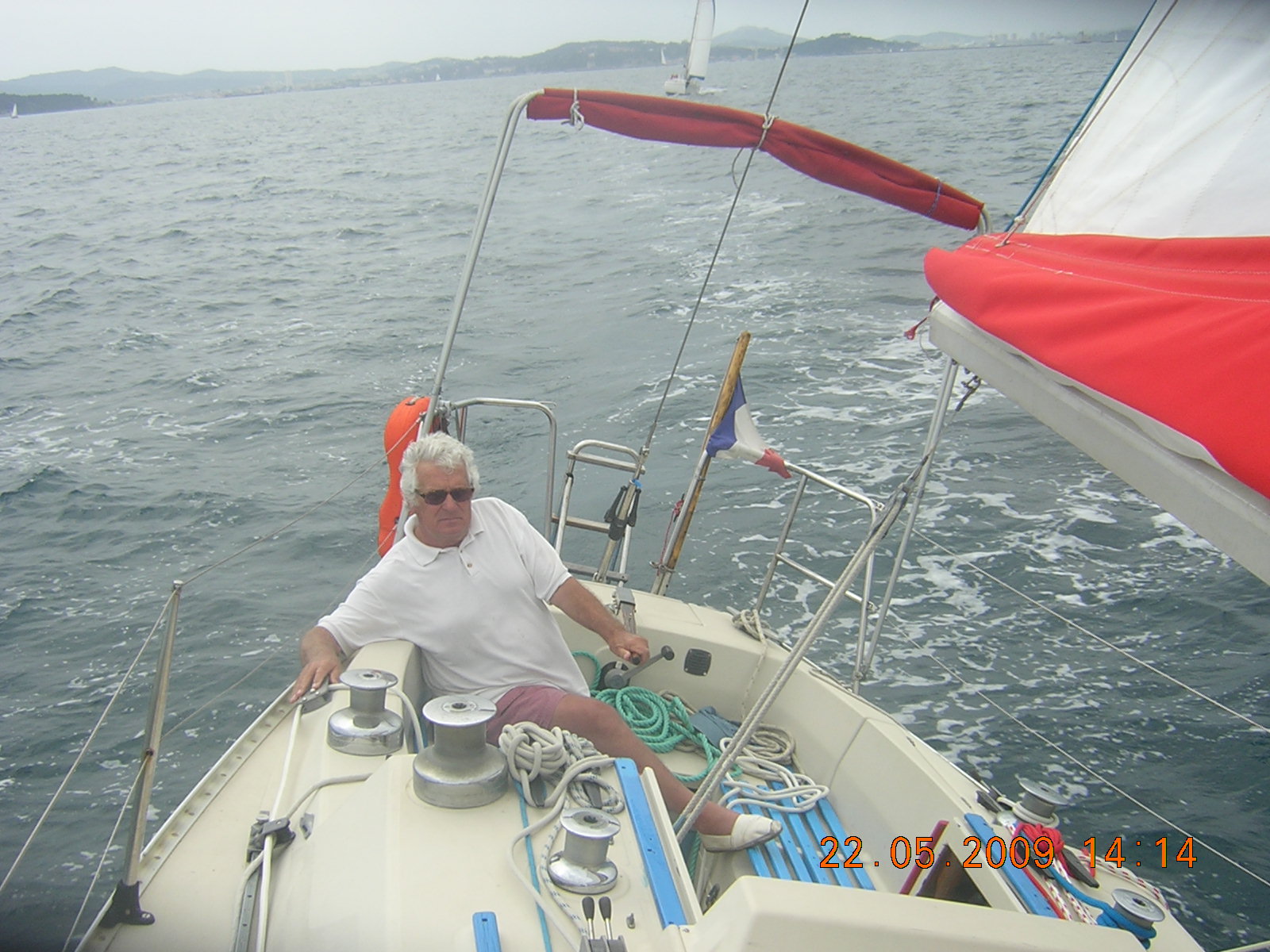 La montagne derrière c'est le cap Sicié , la brise était O.N.O établi à 50 noeuds je naviguait sous trinquette ce qui permettait au pilote de tenir, sinon aux allures portantes
