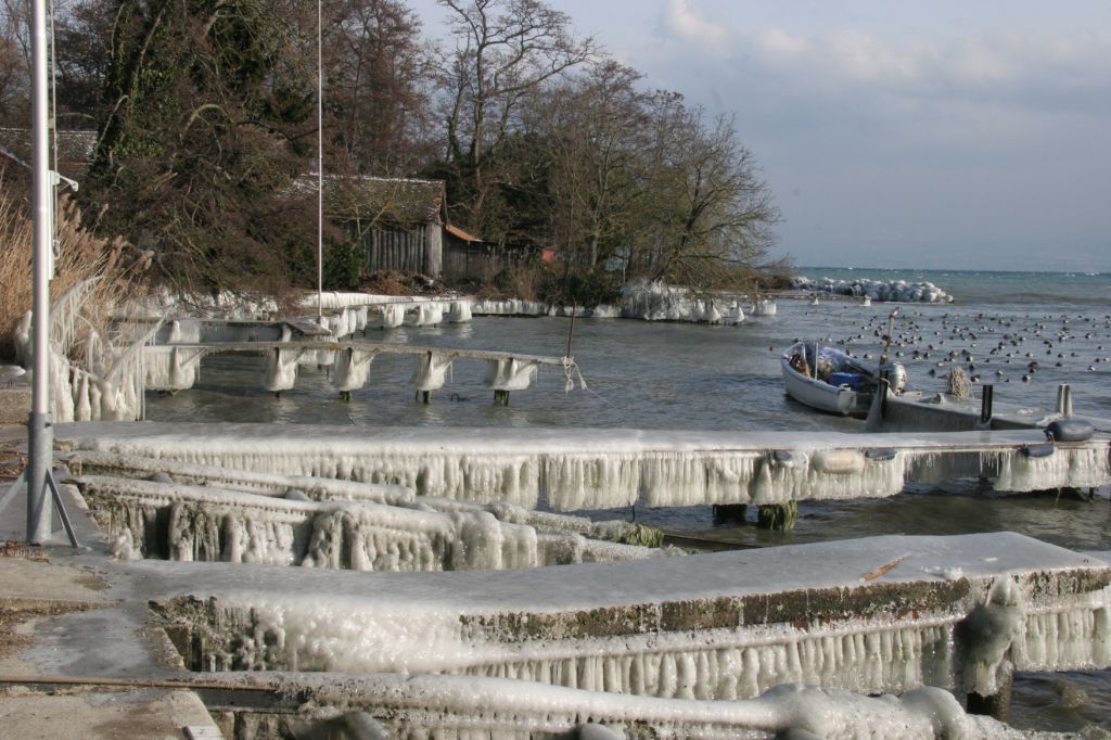Apres avoir vu une photo de bateau et voiture gelé autour du leman dans un journal,j'ai de suite appellé un ami qui habite au dessus du port,il m'a confirmé qu'il y a pas grand chose sur le bateau.Meillerie (au nord du lac) est un port assez protegé.