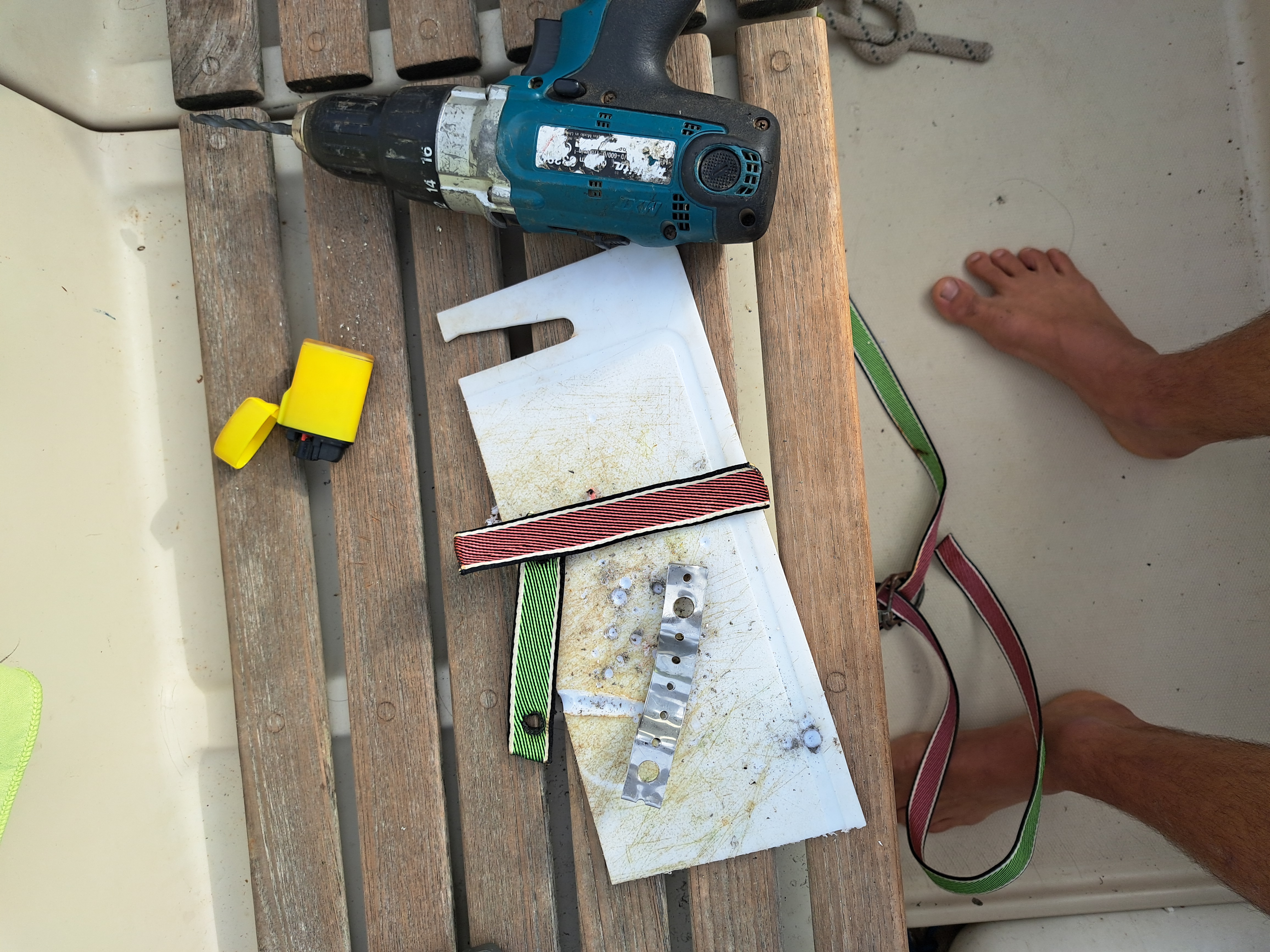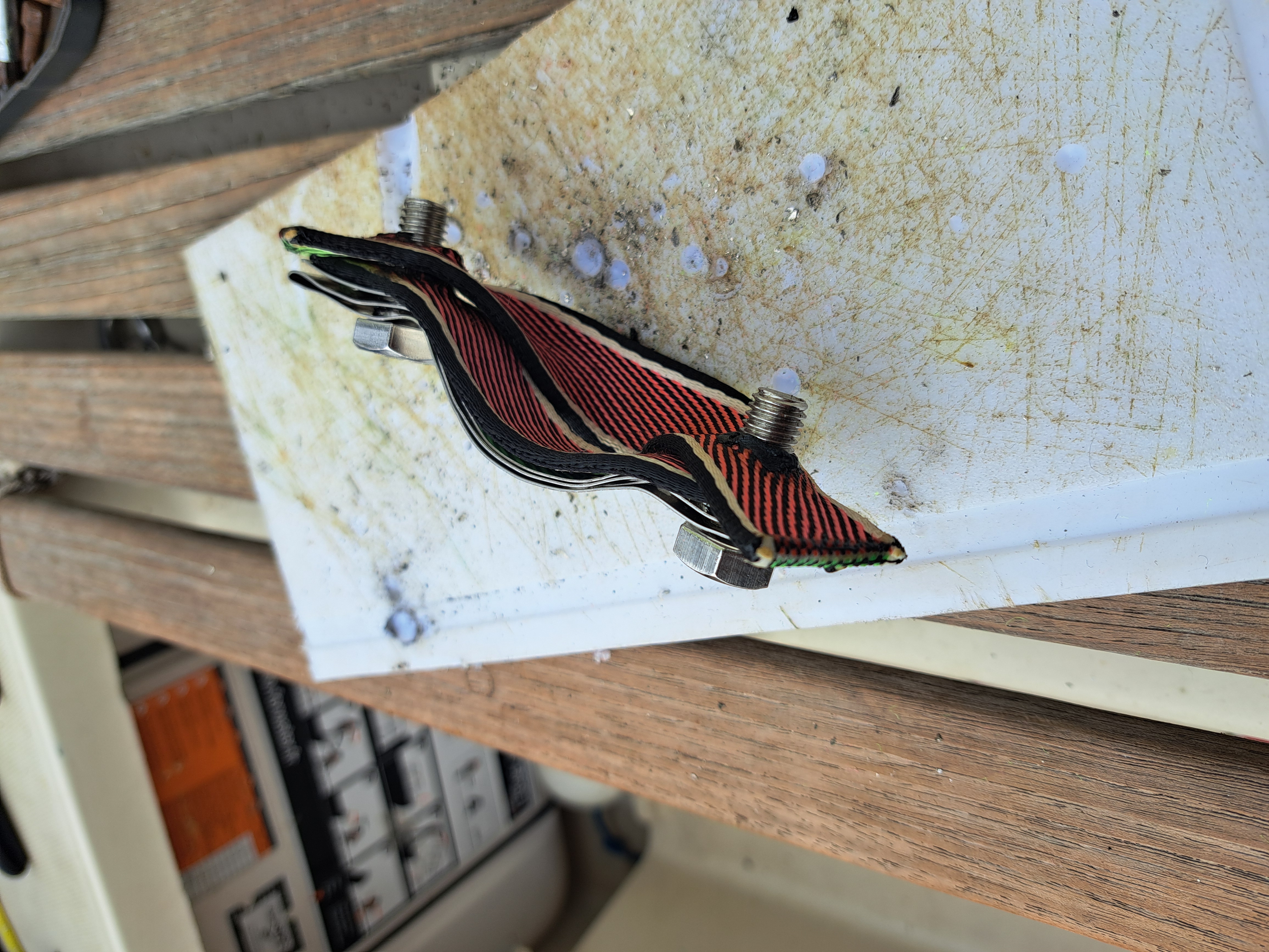 Pas de chantiers dans ce coin perdu, on a dû faire avec les moyens du bord (heureusement que l'autre partie de la pièce, avec les trous taraudés encore nickel, était restée en place !). Un morceau d'inox plié plusieurs fois, deux nouvelles tiges filletées et de la sangle épaisse pour éviter la friction métal/métal et pour jouer le rôle de butée. Et puis noyer le tout sous du sika après serrage en apnée.
