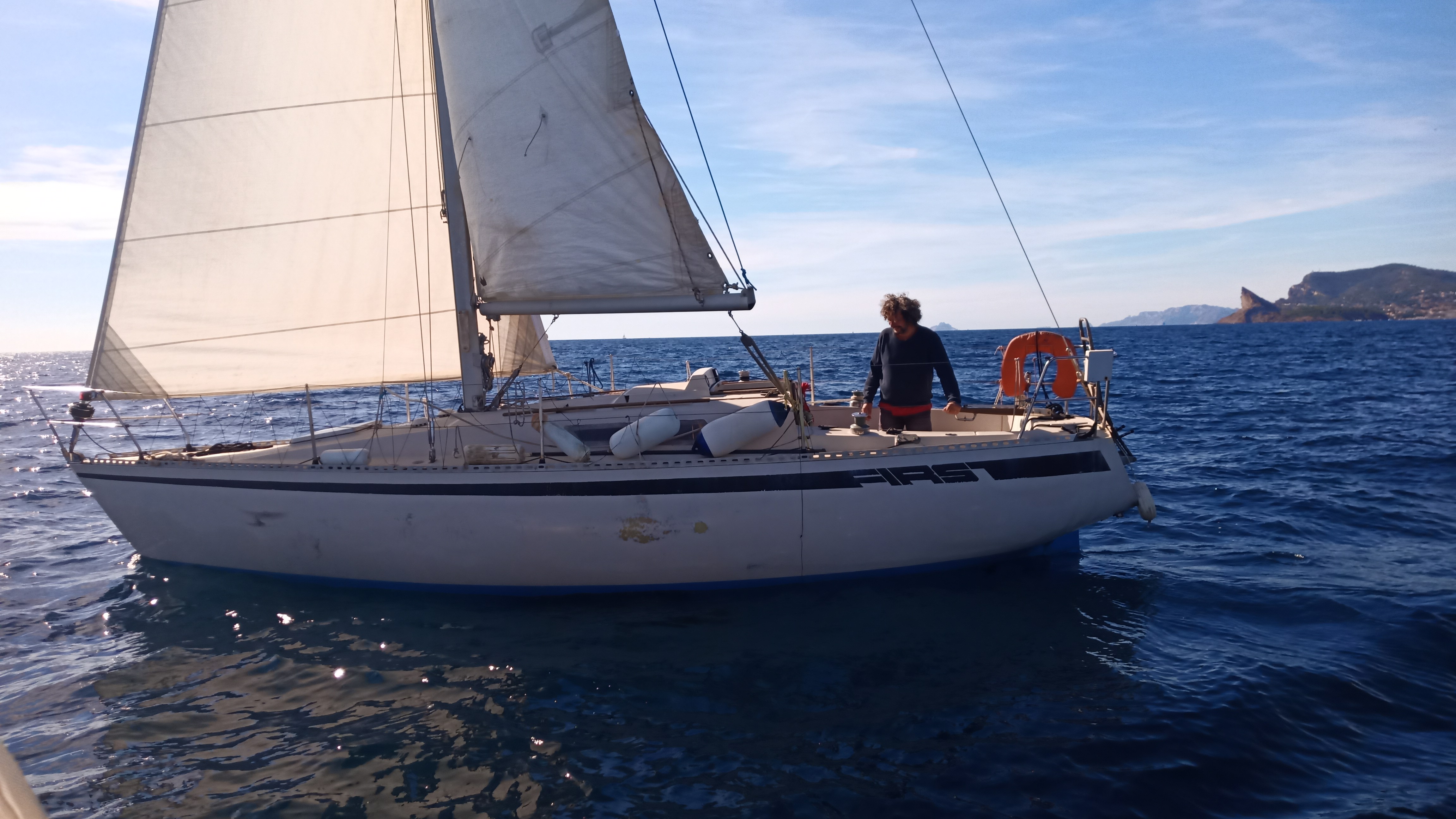 Rencontre de Mathias sur son Barracuda, basé aux Embiez, il allait à la Ciotat. Il n’a pas pu nous rejoindre samedi, le vent de face bien trop fort.
