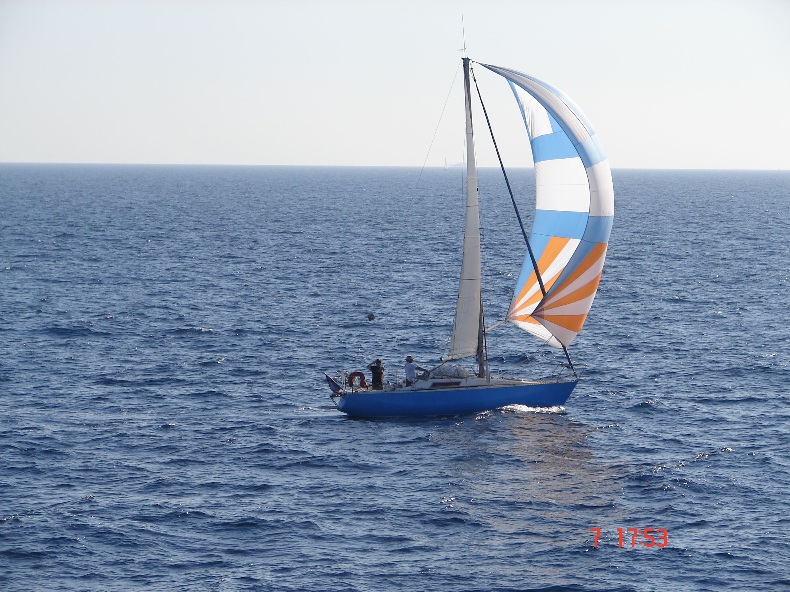Voici quelques photos de mon venerable first 30 le "Zeph" prise par un de mes amis depuis un bateau beaucoup plus gros et beaucoup plus "gris" alors que nous étions de retour de Porquerolles avec une cargaison d 'une dizaine de cartons de l’excellent vin de cet île (qui depuis a bien sur été consommé avec modération