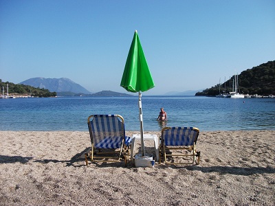 - Face à la plage (qui plonge rapidement) avec une ancre derrière et une autre sur la plage.